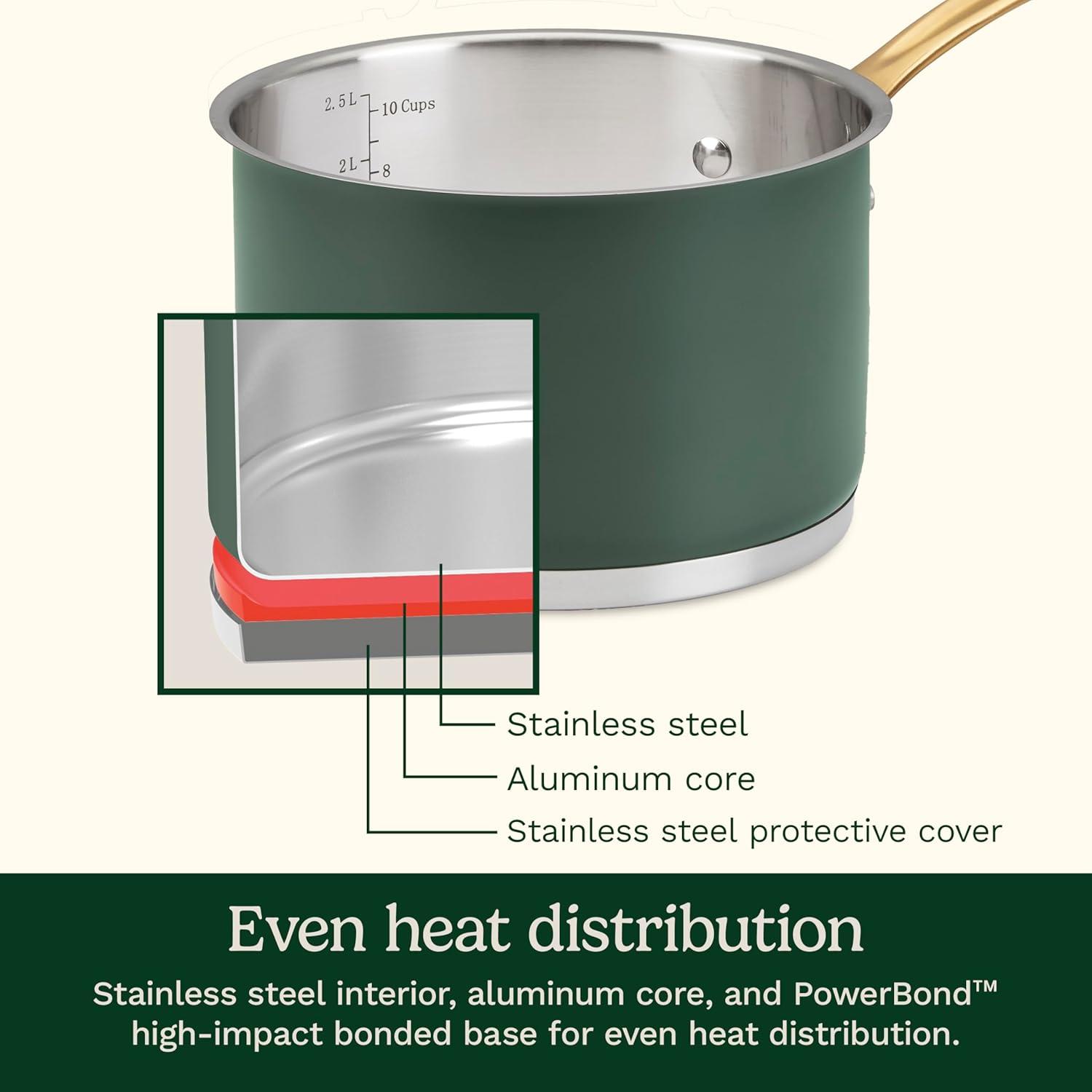Riveted stainless steel Cool Grip stick handles, with gold/blush bronze PVD, stay cool on the stovetop