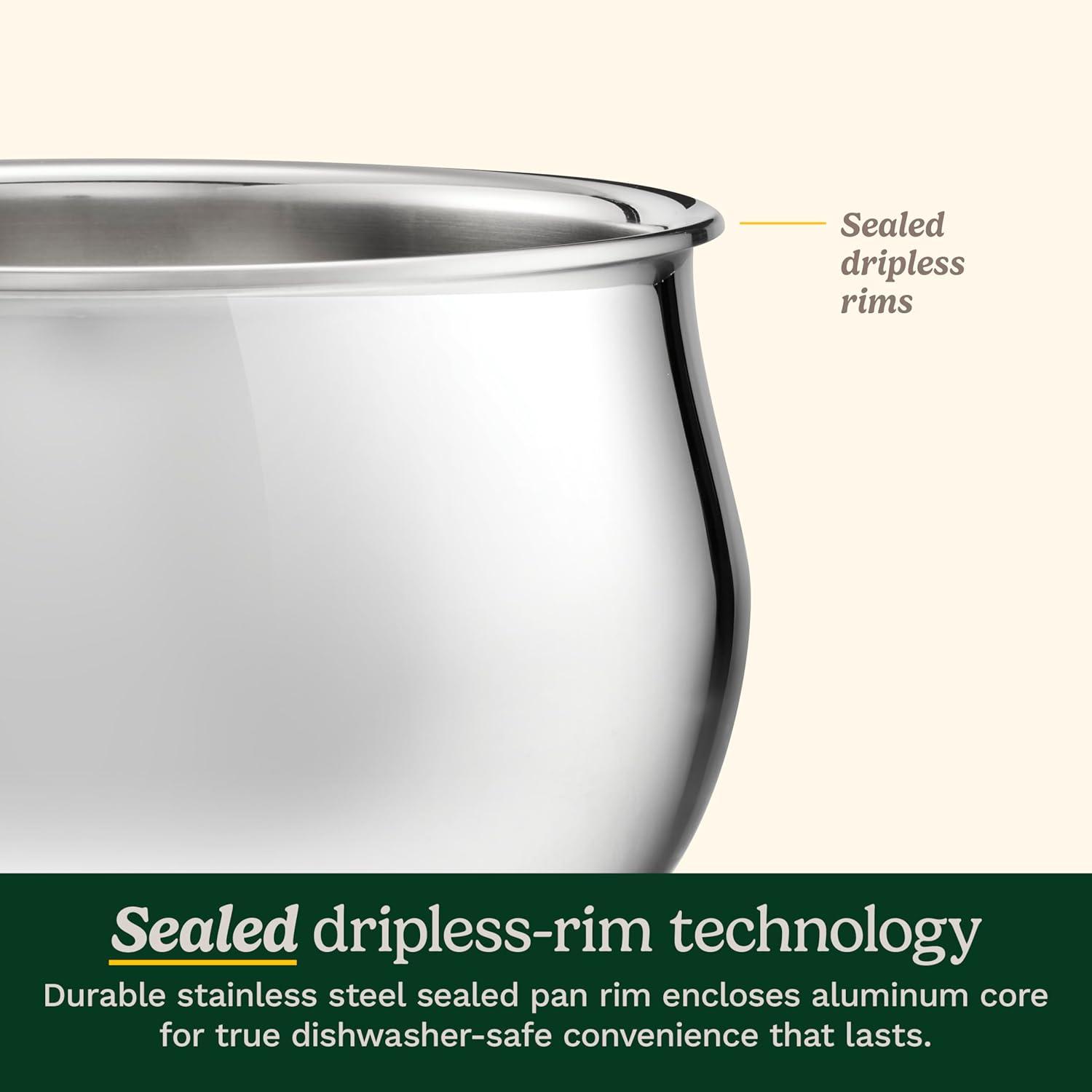 Sealed dripless rim technology features a smooth and closed pan rim for added durability. Dishwasher safe