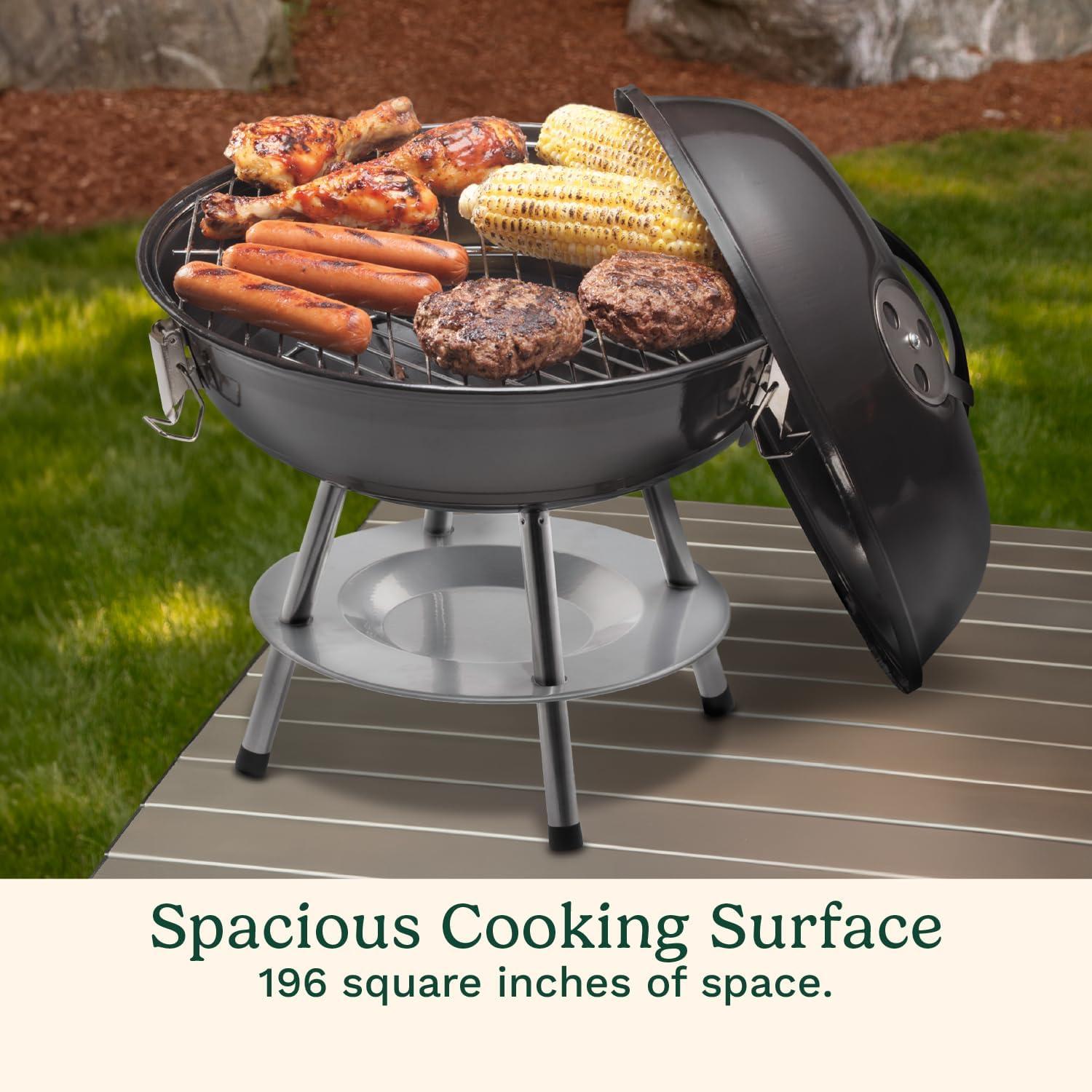 SPACIOUS COOKING: This small charcoal grill features a 196 sq. in. chrome-plated grate resists rust and makes cleaning quick and easy.