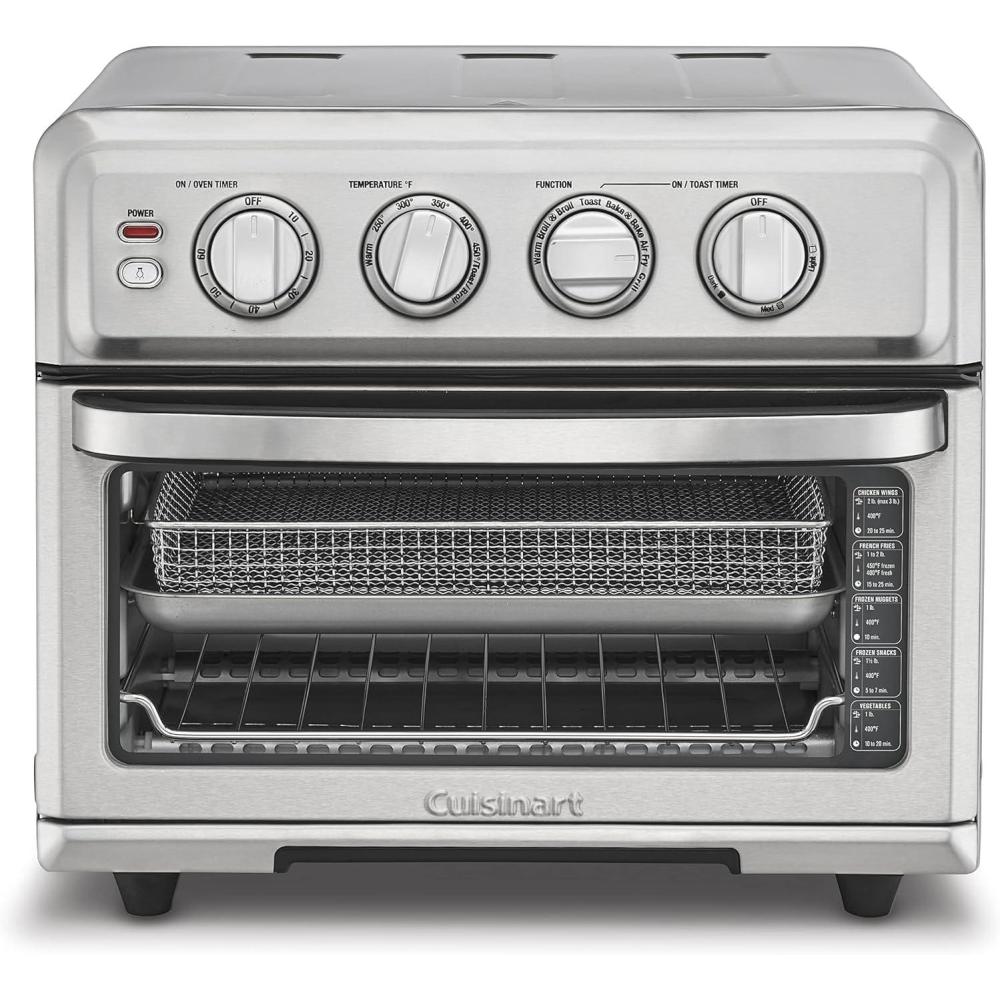 The premium Cuisinart® Air Fryer Toaster Oven with Grill delivers 8-in-1 convenience and large capacity to cook for a crowd. In addition to air frying french fries, baking cookies, or warming up leftovers, this 8-function air fryer includes toast, convection bake, bake, convection broil, broil, grill, and a warming feature. Sear steaks and vegetables on one side and griddle the perfect breakfast on the other with the dual-sided grill and griddle plate. Bring next-generation cooking to your countertop with the spacious 8-function oven that’s large enough to toast 6 slices of bread, air fry 3 lbs. of chicken wings, bake a 12” pizza, or roast a 4-lb. chicken. Equipped with an adjustable temperature dial, 60-minute timer/auto-shutoff, and a toast shade selector, this air fryer toaster oven features a wide temperature range (Warm-450°F) to ensure your meals are cooked to perfection. AirAdvantage® technology with top fan/heater assembly provides optimized hot air flow for fast and crispy results, locking in flavor and giving food the crispy texture you love. The Cuisinart® Air Fryer Toaster Oven TOA-70NAS includes an interior oven light, oven rack, baking pan, air fry basket, reversible grill/griddle, and a stainless steel easy-clean interior to make cleanup simple.