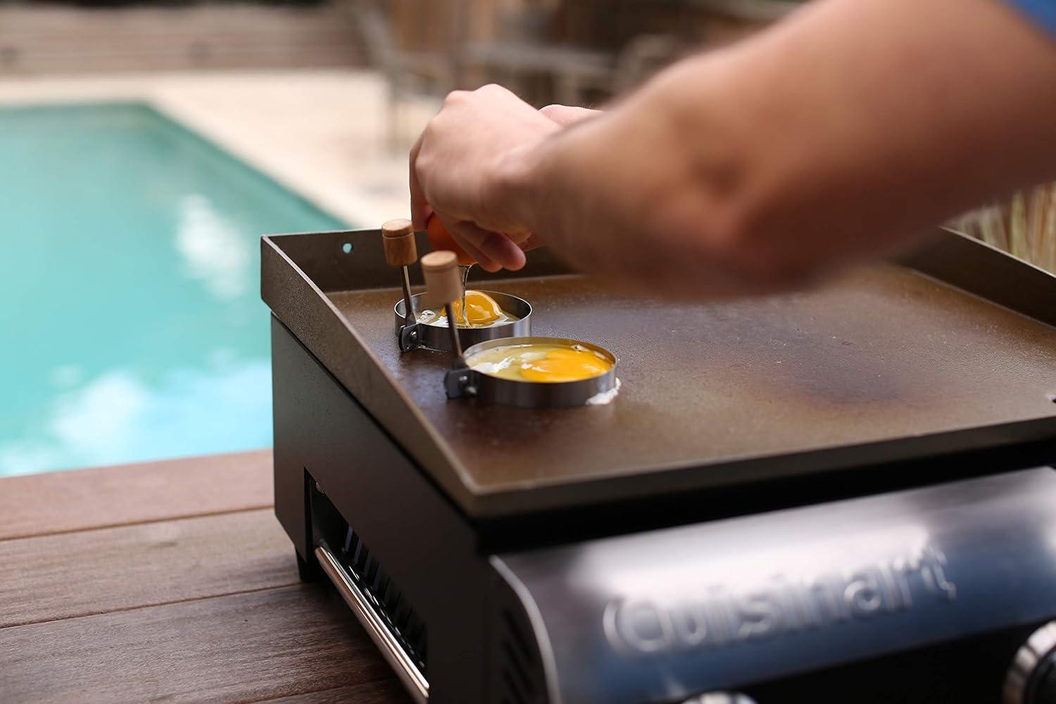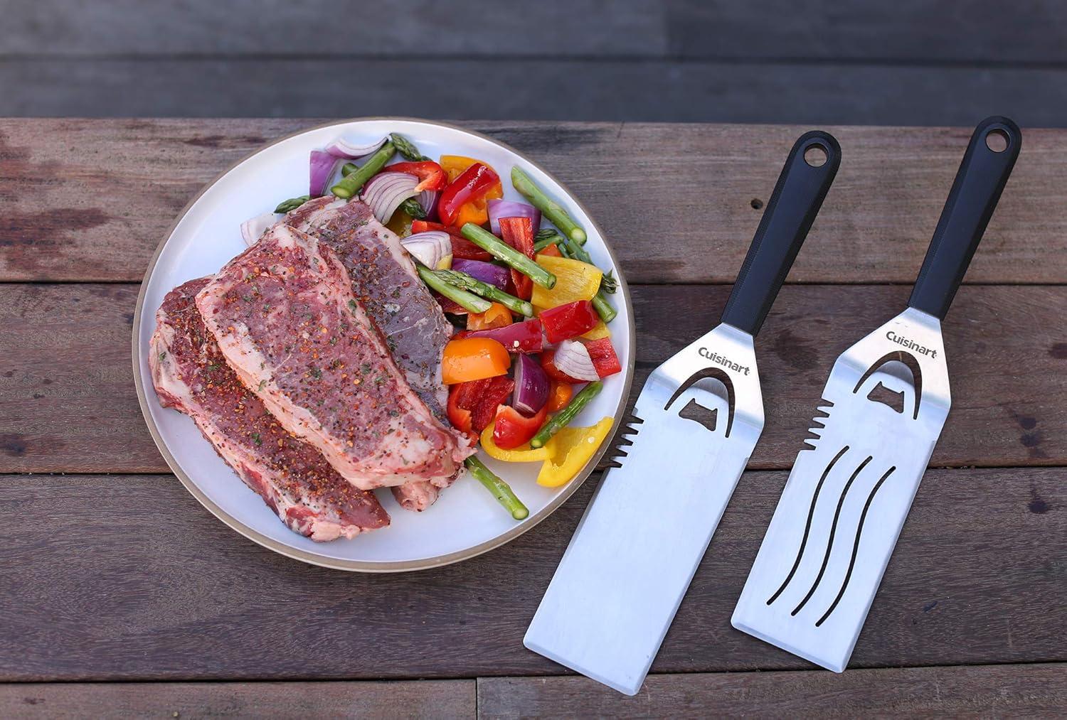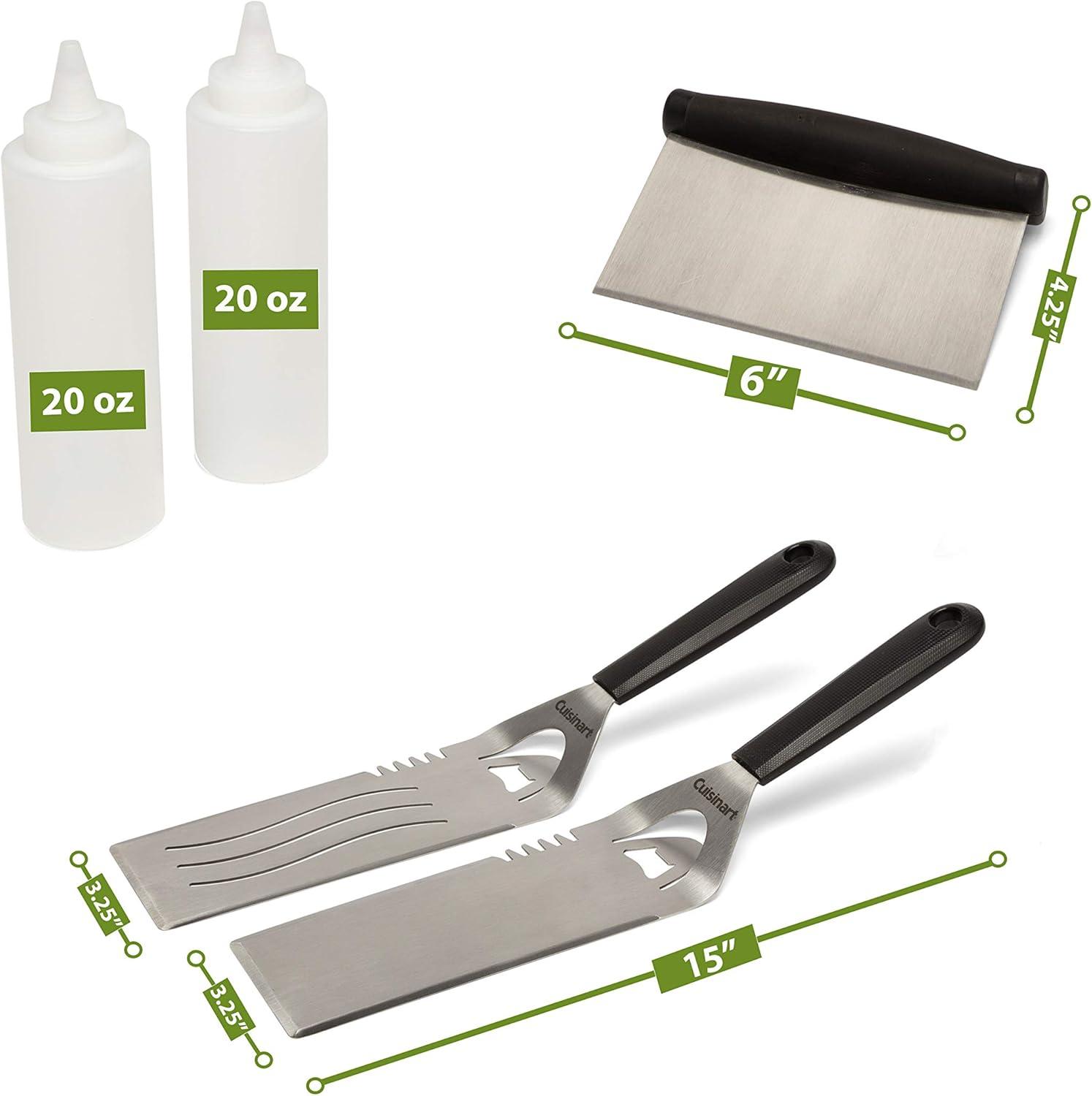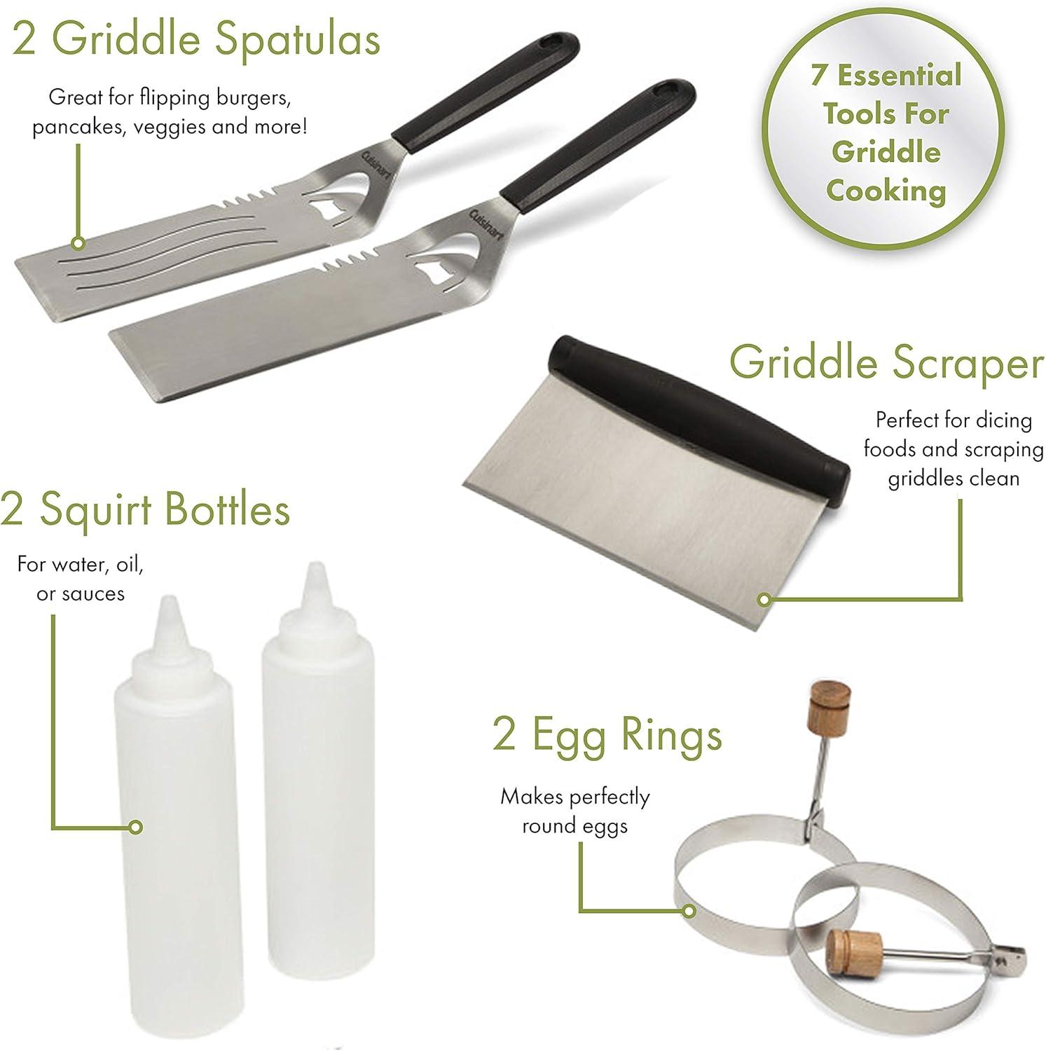 The Cuisinart griddlin' Kit is the best set of tools for a griddle & the tools are perfect for making breakfast, burgers & everything in between. The tool set includes the seven essential tools for griddle cooking. There are two elongated, multi-functional spatulas with bottle openers. The Elongated steel makes them ideal for a griddle surface. Also included in the kit are two squirt bottles for water, oil, or sauces. Two perfect egg making rings allow you to make a large breakfast without losing most of the eggs along the way. & of course a griddle scraper is included in this kit to make cleanup a breeze.