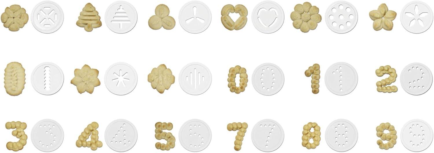 Cookie press includes 18 design discs and 6 decorating tips