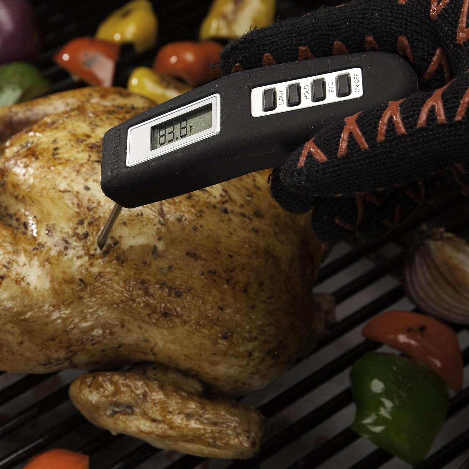 The Cuisinart Digital Folding Probe Thermometer is a simple and effective way to check in on the readiness of your grilled meats. This thermometer has a digital LCD display that reads internal meat temperatures instantly. The probe is long enough to fit in any sized meat cut and folds into base for convenient storage. Built-in LED light allows for grilling at night. Comfortable grip and the folding probe provide perfect angles and comfort when reading temperatures in hard to reach places.
