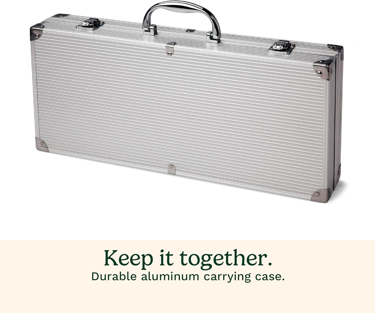 ALUMINUM CARRYING CASE: Our sturdy, stylish and compact aluminum carrying case perfect for easy transport and organized storage of your grill set.