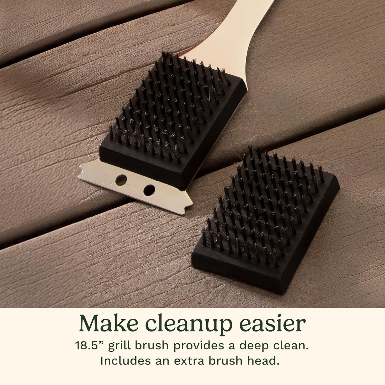 GRILL BRUSH & TEMPERATURE FORK: The 18.5” cleaning brush and extra brush head make cleaning up easier. The digital temperature fork ensures perfect results with an alarm to prevent overcooking.