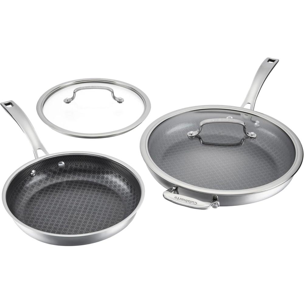 The Cuisinart FusionPlus™ Nonstick Stainless Steel 4-Piece Cooking Set includes 10” and 12″ skillets with matching covers, professional stainless steel construction, polished exterior finish, and aluminum-encapsulated base for even heating. Featuring an exclusive PFAS-free* PURELYSEAR™ surface to uniquely preserve your ceramic nonstick performance, this 4-piece cookware set provides perfect frying, browning, and searing power while cooking a variety of foods. ArmorGuard® interior utilizes stainless steel peaks to form a shield around the ceramic nonstick interior, creating a highly durable, scratch-resistant cooking surface that’s metal-utensil safe, built to last, and easy to clean. Cast stainless steel Cool Grip™ stick handles with V-flange design help dissipate heat away from the handle and keep it concentrated in the pan itself for stick handles that stay cool to the touch on the stovetop. Before cooking, heat the pan for about 2 minutes over medium low heat. A properly heated pan improves searing, prevents sticking, and preserves the nonstick surface. Once preheated, add oil or butter and let it warm before adding food. Conveniently dishwasher safe, this nonstick stainless steel Cuisinart cookware set is also oven safe up to 500°F (lids 450°F) and compatible with all stovetops, including induction. *No intentionally added PFAS