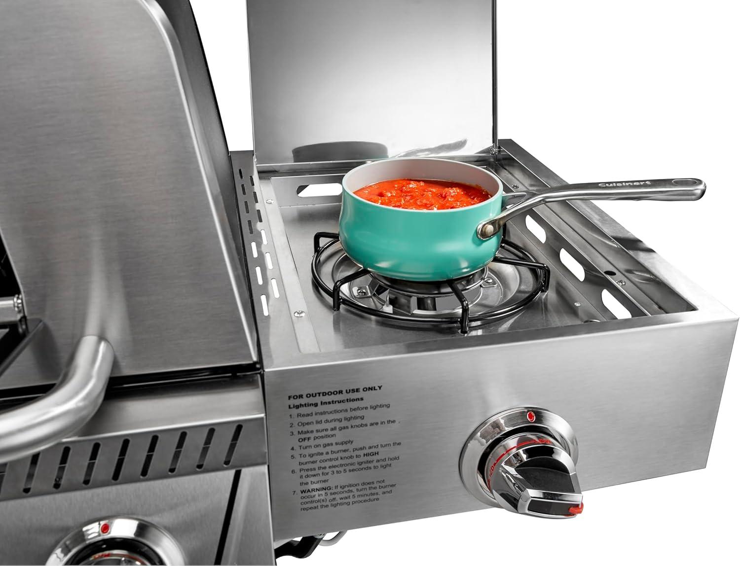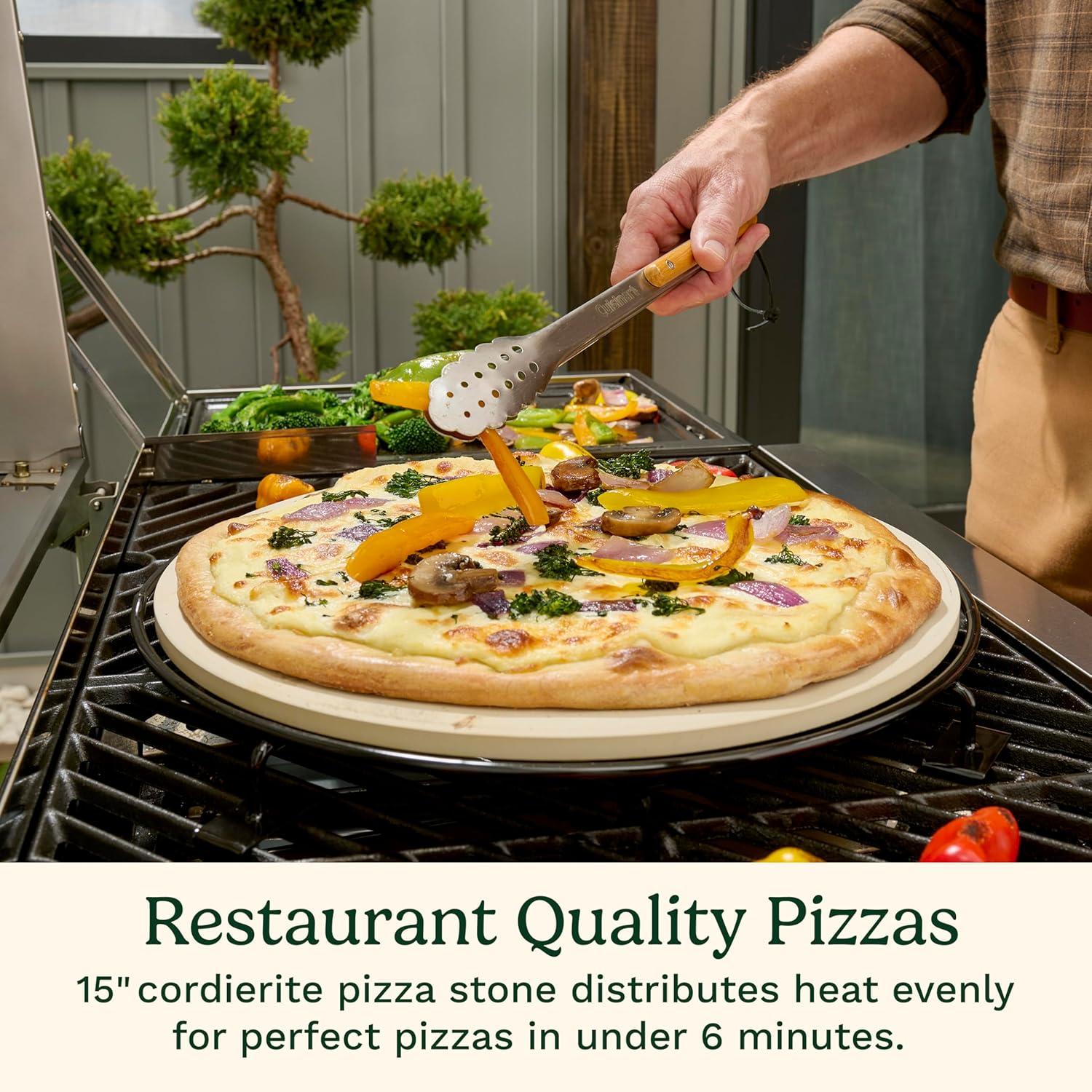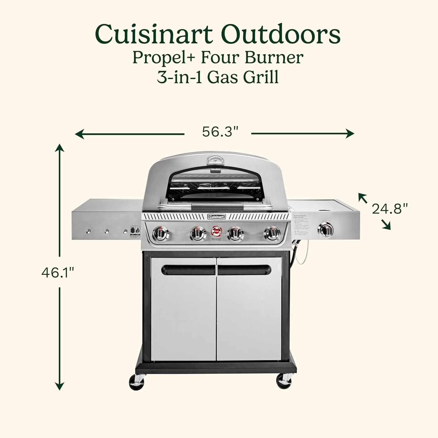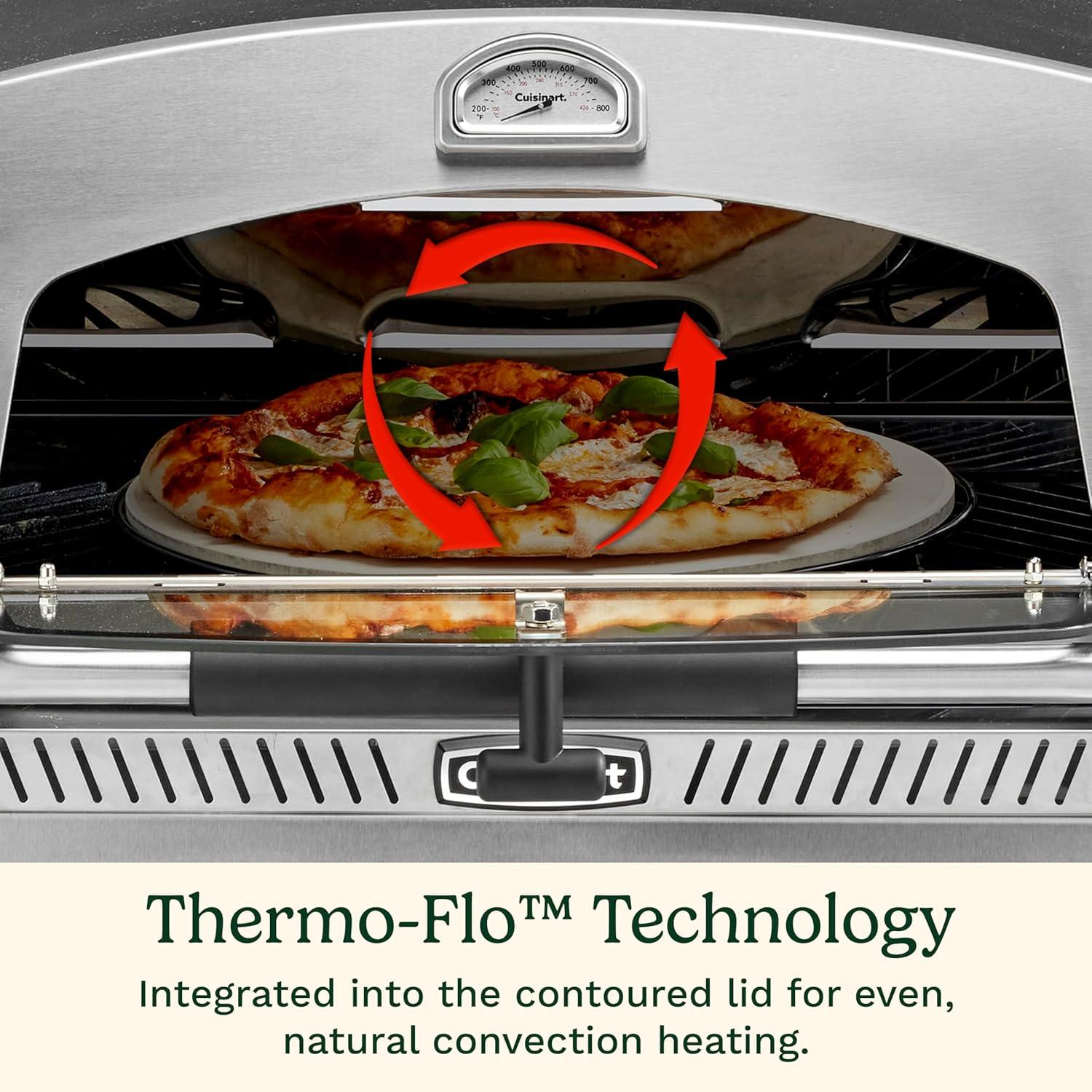 Explore all of the endless possibilities you can create with the Cuisinart 3-in-1 Grill, Griddle & Pizza Oven! This one-of-a-kind unit combines 3 cooking functions in to one appliance; Grill, Griddle, and Pizza Oven. GRILL With up to 260 sq. in. of cooking space and a 15,000 BTU burner, this grill can match the performance of any full size unit. The cast iron griddle plate provides maximum heat retention and even heating across the surface. With temperatures reaching over 700° F you'll be able to get that restaurant-quality sear right at home! GRIDDLE The heavy-duty, cast iron griddle plate offers up to 230 sq. in. of cooking space and gives you the versatility to cook breakfast, lunch, or dinner. The grease drain hole on the griddle plate is located directly above grease cup, so grease is routed directly towards the cup. This significantly cuts down on grease build up and potential flare ups when grilling. PIZZA OVEN As a pizza oven, the unit features a 13″ cordierite pizza stone which retains and distributes heat evenly across the surface for a perfectly cooked crust every time. The stone is secured by pegs on the bottom of the grill grate that not only keep it centered in the oven, but slightly raise it off the surface to allow for natural convection heat around the pizza. The pre-set pizza temperature setting let's you cook with confidence knowing you are at the perfect temperature for pizza cooking. The thermometer includes a “Pizza” zone that has a corresponding setting on the dial. Once the thermometer reaches the Pizza zone, simply turn the dial to the pizza setting and you're ready to cook. DUAL-HINGED LID The dual-hinged lid design acts like a standard grill lid, flipping up and down, allowing for greater cooking versatility while griddling and grilling. The lid also features a drop down pizza oven door that allows for easy access in to the oven with minimal heat loss. This allows for a more efficient pizza cooking process. COOKING SURFACE STORAGE Easily switch to grill or griddle mode by simply swapping out the cooking surface for whatever function you want to use. When not in use, all of the cooking surfaces neatly pack away on the storage shelf below, keeping all components together. The travel-friendly design of the 3-in-1 Grill, Griddle & Pizza Oven allows you to easily pack it in to the trunk of your car and will be the star of your next BBQ, tailgate, or camping trip! With all of this cooking versatility, you're going to need the fuel to keep up. That's why the 3-in-1 Grill, Griddle & Pizza Oven comes equipped with a gas hose for a 20 pound propane tank, so you can keep on cooking throughout the day! The Cuisinart 3-in-1 Grill, Griddle & Pizza Oven will make you re-think what is possible when cooking outdoors!