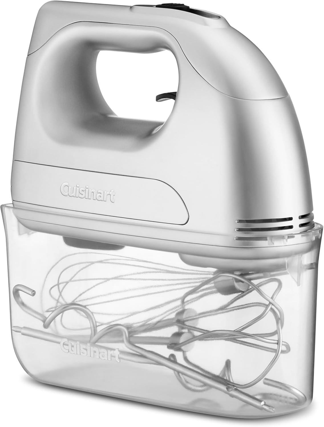 Equipped with a 200-watt motor to power through any mixing task, the Cuisinart Power Advantage 7-Speed Hand Mixer combines compact convenience with professional performance. From beating eggs and mixing batter to whipping cream and kneading dough, this kitchen essential makes it easy for home chefs to add endless variety to family desserts and meals. The simple slide control shifts seamlessly from speed to speed, and the professional-grade attachments—dough hooks, chef’s whisk, and self-cleaning beaters—make the mixer especially versatile. A clear, snap-on storage case keeps the mixer and attachments together.