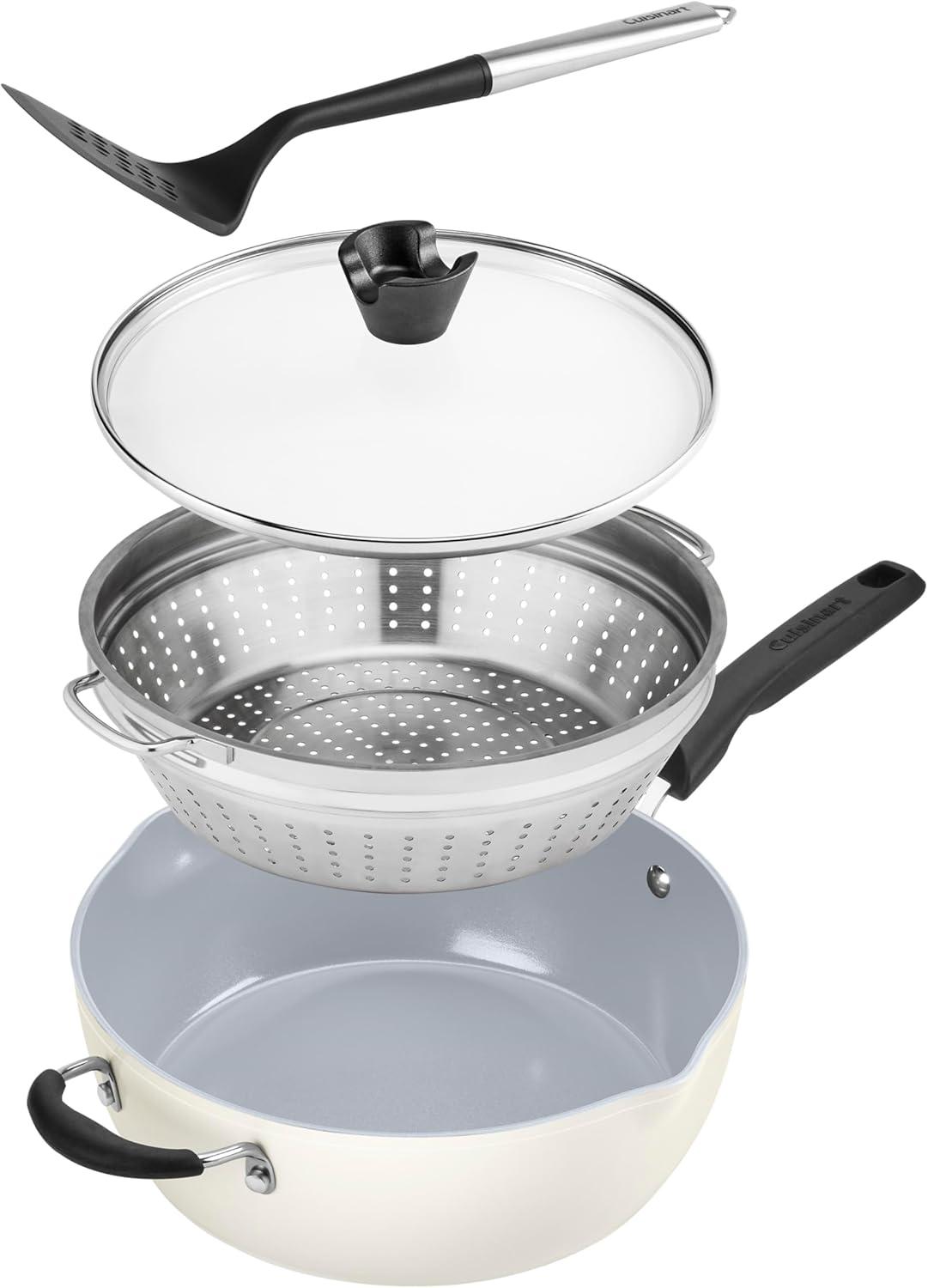 Meet the Preferred Pan – your ultimate culinary sidekick! Enhance your cooking with this versatile 4.5 Qt. capacity multi-purpose pan designed to perform at least 14 cooking tasks – poach, steam, strain, sauté, sear, fry, boil, simmer, sauce, braise, deglaze, brown, bake, roast. This pan features Cuisinart’s exclusive PURELYCERAMIC nonstick interior – manufactured without PFAS, ensuring it is free of PFOS, PFOA, and petroleum – for easy cleanup and is dishwasher safe. Lifetime warranty.