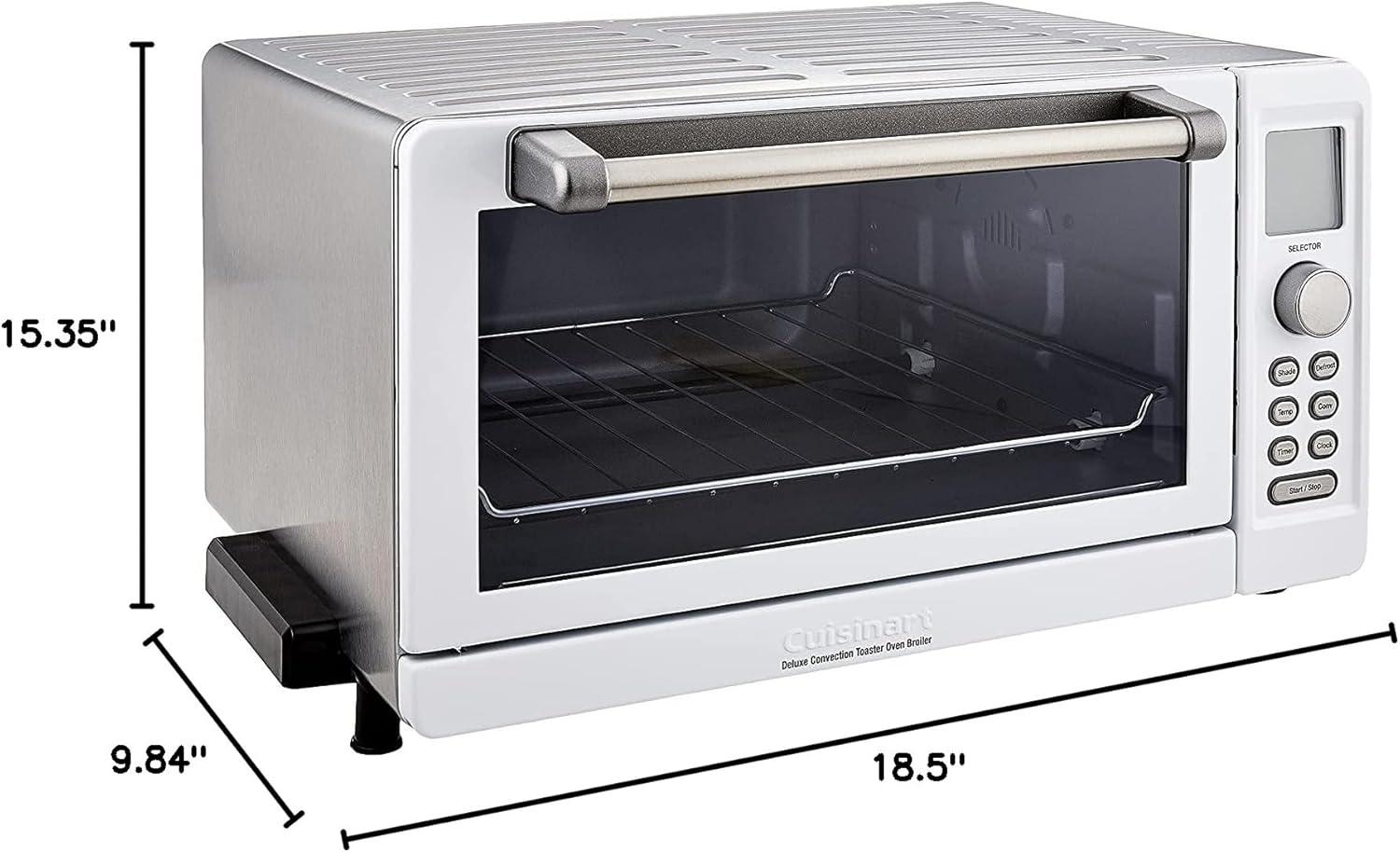 The Cuisinart Deluxe convection toaster oven broiler is designed with 9 functions, including convection for making delicious cakes, potatoes and roasts. Sized to accommodate a whole chicken, a 12-Inch pizza, or 6 slices of bread, the unit is controlled by an electronic dial and LED buttons. The large Blue back-lit LCD allows for the quick and easy setting of function, temperature, and cook time. The exact heat sensor maintains precise oven temperatures, and the always even shade control ensures that toast consistently turns out the selected shade.